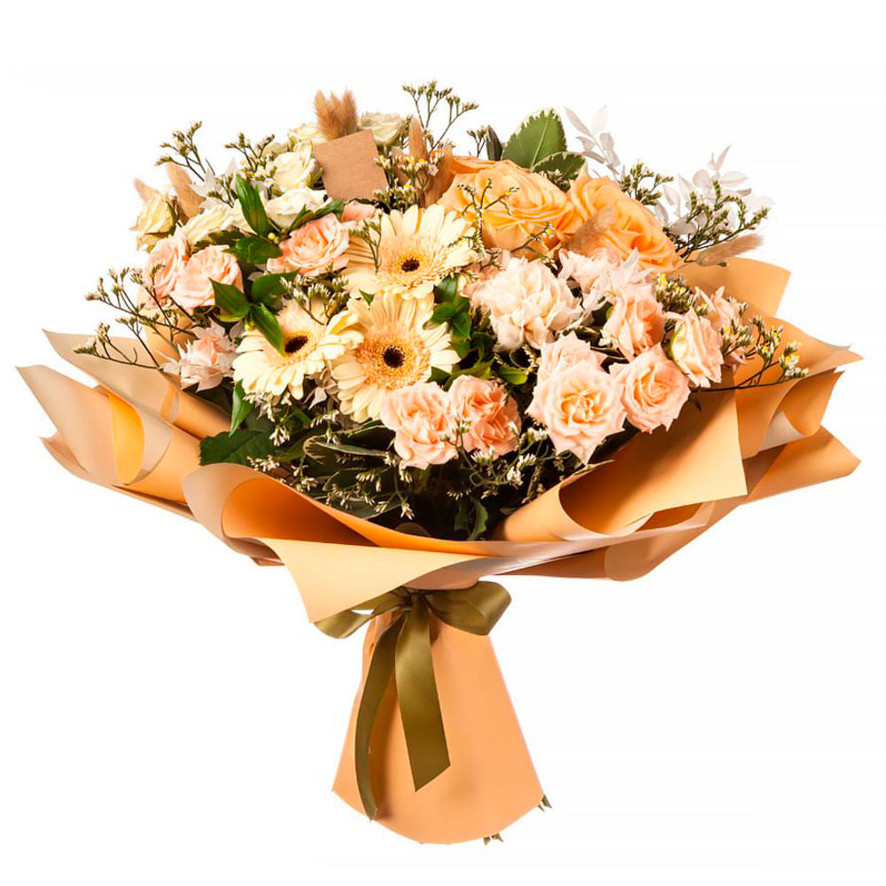Роза одноголовая персиковая, роза кустовая кремовая, гербера кремовая, вереск, зелень. Упаковка (лента, пленка, крафт, сетка, пленка матовая)