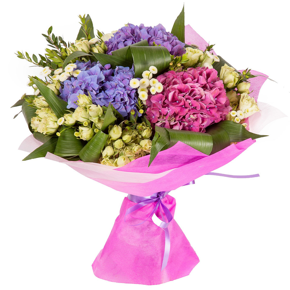 Гортензия розовая и фиолетовая, роза кустовая белая, маргаритки мини, фисташка, аспидистра. Упаковка (лента, пленка, крафт, сетка, пленка матовая)