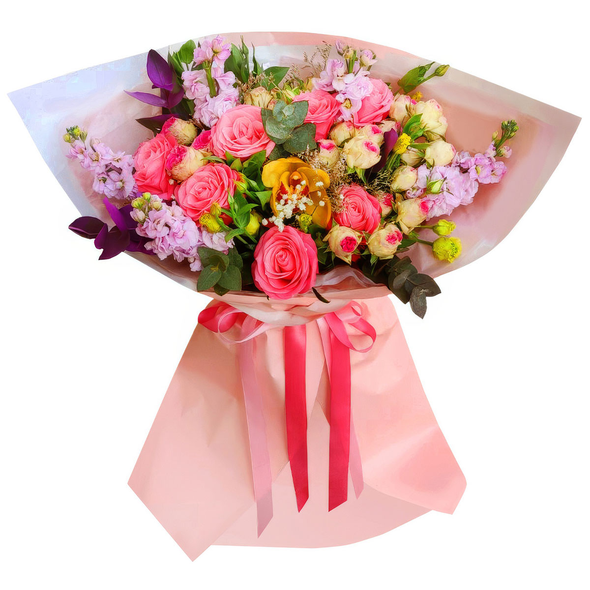 Роза одноголовая розовая, роза кустовая пионовидная розовая, орхидея желтая, маттиола розовая, эвкалипт, гипсофила. Упаковка (лента, пленка, крафт, сетка, пленка матовая)