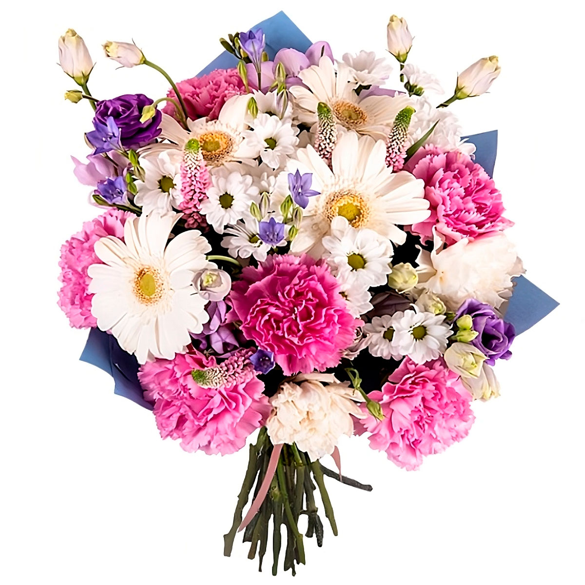 Гербера белая, хризантема кустовая белая, гвоздика розовая и белая, фрезия сиреневая, вероника, эустома фиолетовая и розовая. Упаковка (лента, пленка, крафт, сетка, пленка матовая)