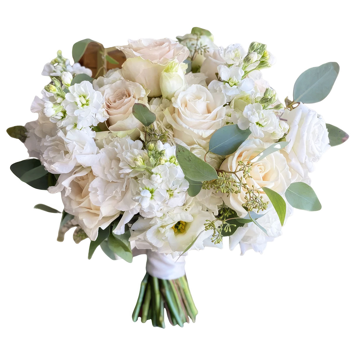 Роза одноголовая белая, маттиола белая, эустома белая, эвкалипт. Упаковка (лента, пленка, крафт, сетка, пленка матовая)