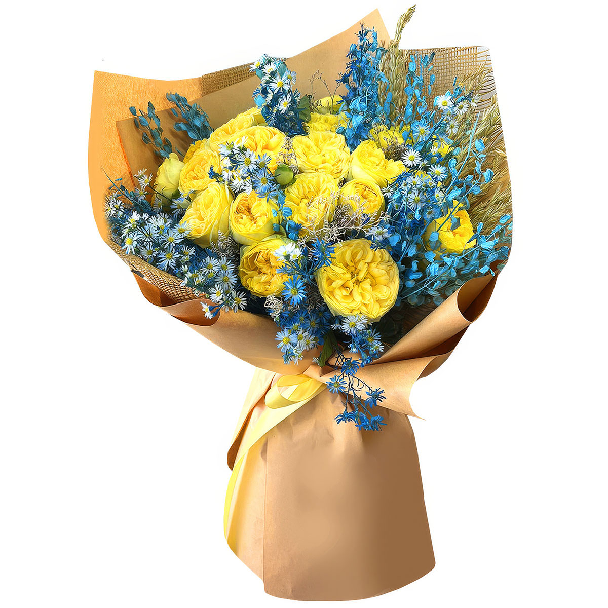 Роза одноголовая пионовидная желтая, ромашка голубая, лунария голубая. Упаковка (лента, пленка, крафт, сетка, пленка матовая)