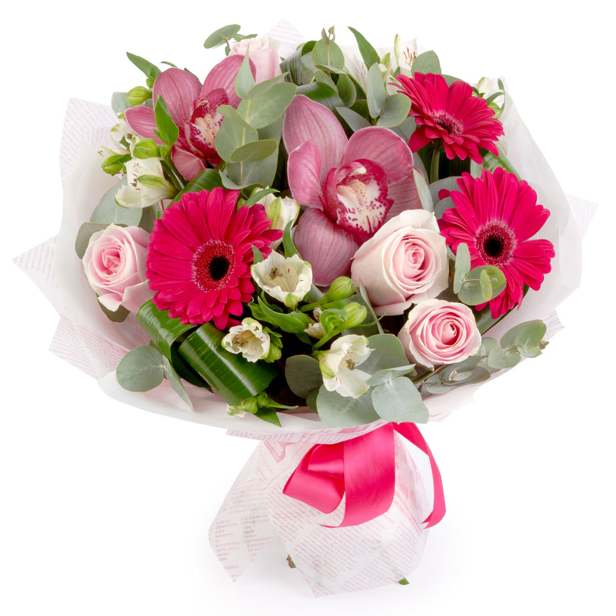 Орхидея розовая, гербера розовая, роза одноголовая розовая, альстромерия белая, аспидистра, эвкалипт. Упаковка (лента, пленка, крафт, сетка, пленка матовая)
