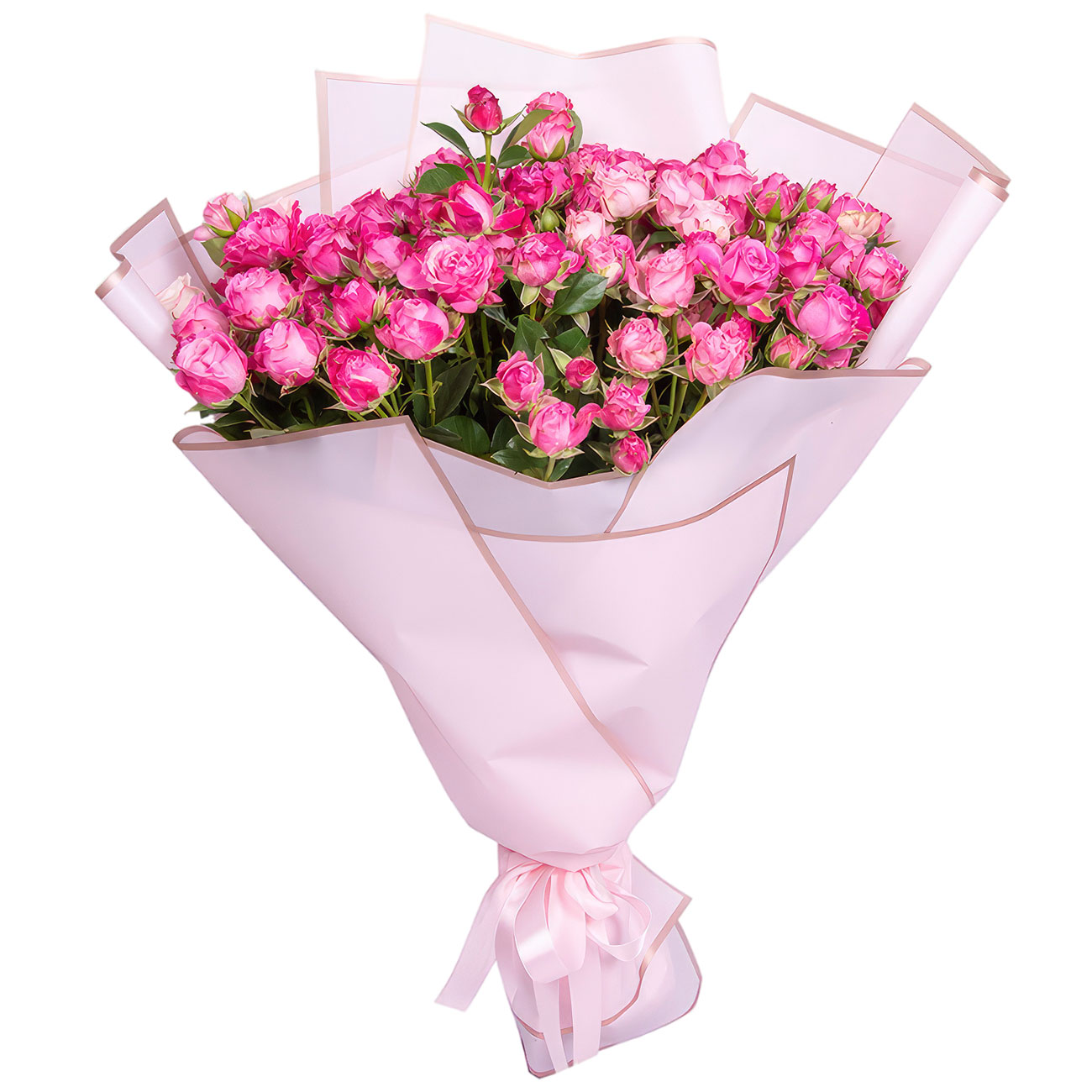 Роза кустовая «Бомбастик». Упаковка (лента, пленка, крафт, сетка, пленка матовая)