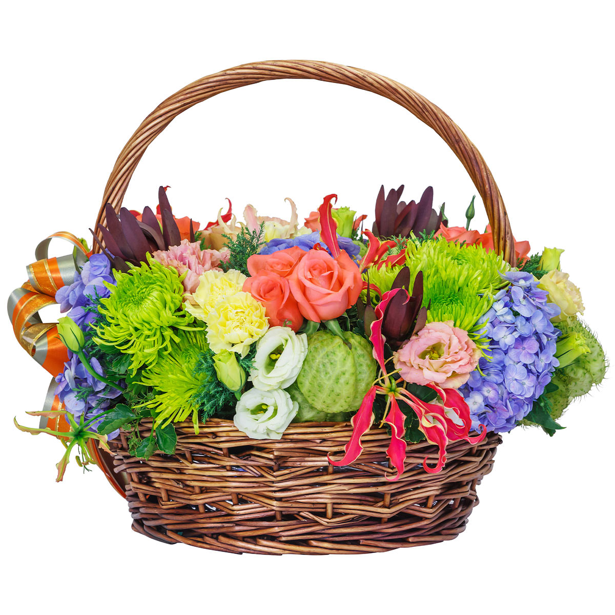 Гортензия голубая, хризантема зеленая, эустома белая и розовая, роза кустовая коралловая, глориоза, гвоздика желтая, протея, кактус. Упаковка (Корзина, оазис, ящик).