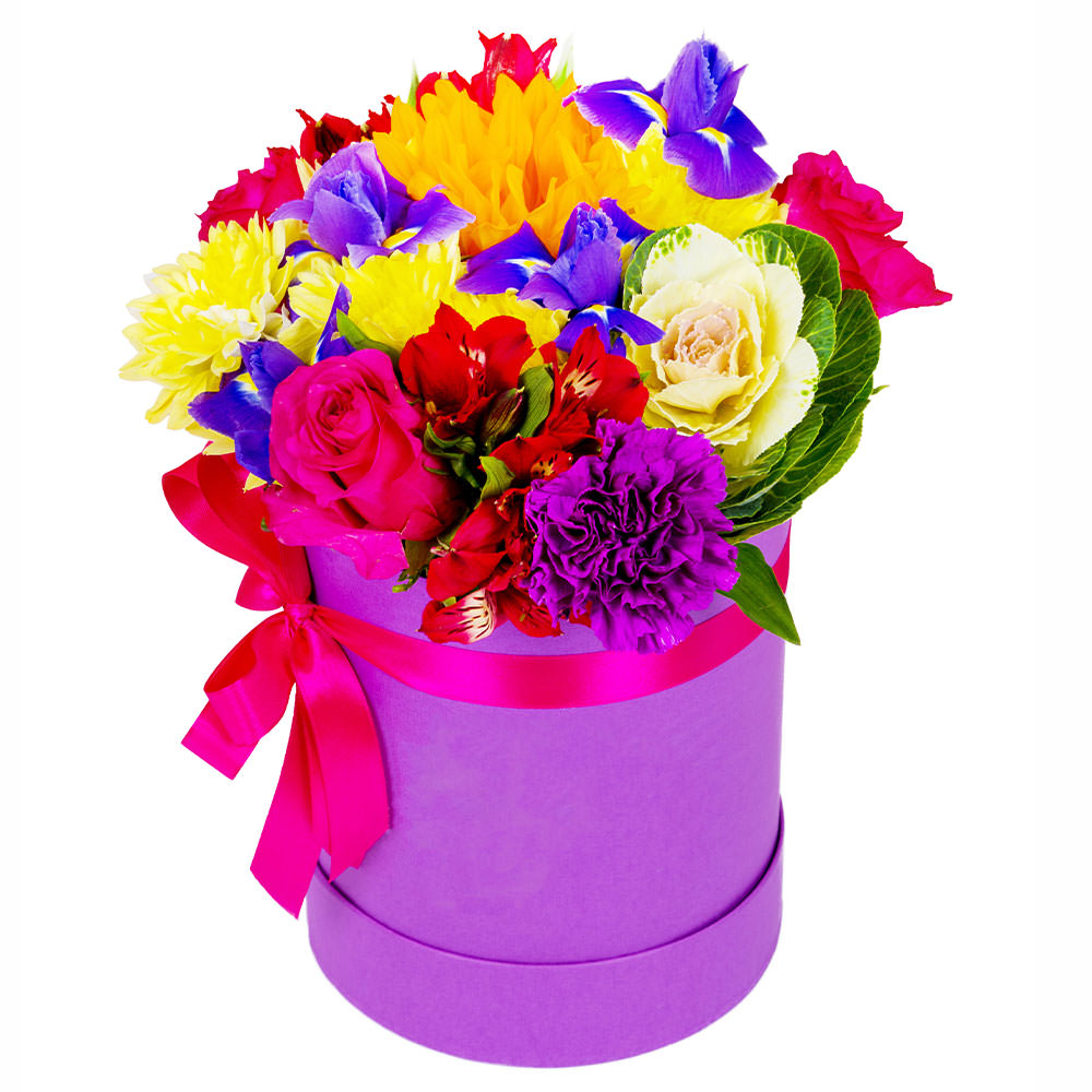 Роза одноголовая розовая, альстромерия красная, хризантема кустовая желтая, ирис, гвоздика фиолетовая, брасика. Упаковка (шляпная коробка, квадратный бокс, коробка сердце, оазис)