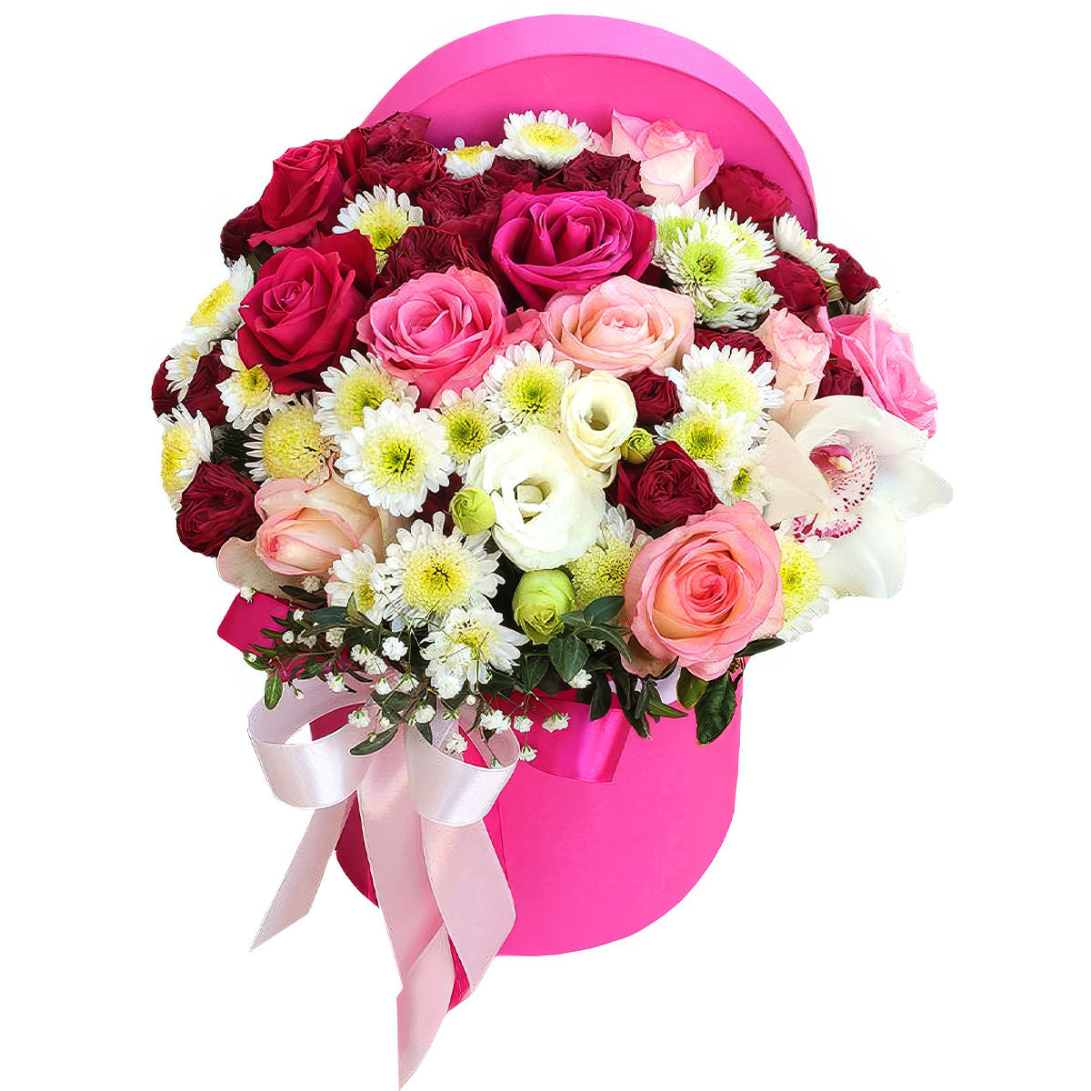 Роза одноголовая розовая, роза кустовая пионовидная бордовая, орхидея белая, хризантема кустовая белая, гипсофила, зелень. Упаковка (шляпная коробка, квадратный бокс, коробка сердце, оазис)
